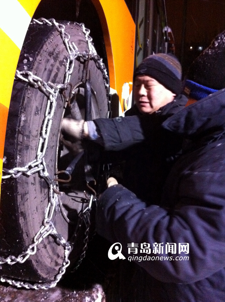 崂山巴士200余名突击队员分乘40部车辆分别到300多个站点和70余个路段抛撒融雪剂。突击队员们在一辆公交车上装了70袋融雪剂,从福州路北小区公交车站出发,沿途在伊春路、连云港路、威海路等十几个路段和20多个站点抛撒融雪剂。随车同行的501路驾驶员王群说:“这些来撒融雪剂的突击队员都是昨晚没回家留在队上,一是每隔两小时发动一次车,以确保次日早班车的准点发出;二是在每辆车的前风挡喷洒防冻液,以保持前风挡的通透性;三是融雪剂要在凌晨2点撒,为早晨运行的公交车提供安全保障。”