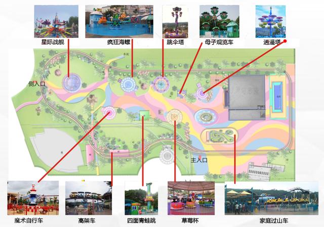 以保留原有项目格局,不破坏园内绿化为前提,利用原有项目场地进行升级换代,同时利用乐园东北方废弃场地开发富华儿童欢乐世界板块,在东侧草地、竹林区域新增冒险家乐园板块,创造新的经营增长点,并对园内的电力系统、建筑物、道路、绿化等配套设施进行改造和翻新。
