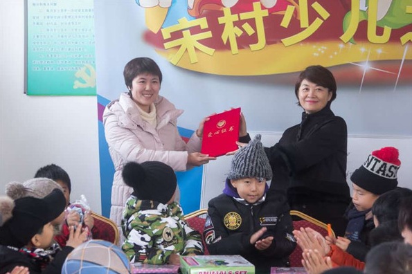 在少儿之家课堂,文登路小学的学生和宋村的孩子们一起互换精心准备的礼物、分享蛋糕并开展了丰富多彩的户外活动。2018级1班全班同学为宋村捐赠图书200余册,书包与学习用品100多份以及篮球、足球、羽毛球、跳绳等部分体育用品。市政府办公厅机关党委专职副书记单丽同志向班级赠送了爱心证书,驻村第一书记王玉峰同志介绍了驻村帮扶与开展星期六兴趣班的情况。