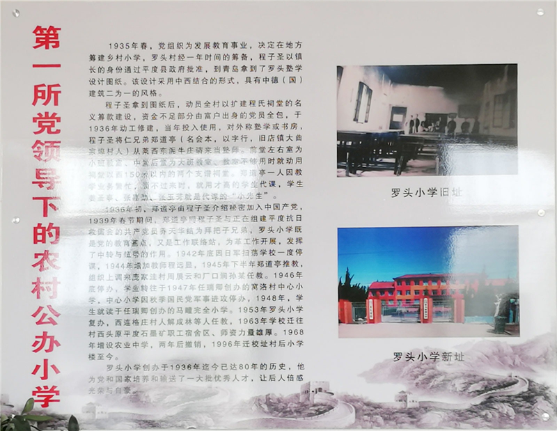 1935年春,党组织为发展教育事业,决定在地方筹建乡村小学,罗头村经一年时间筹备,程子圣以镇长的身份通过平度县政府批准,到青岛拿到了罗头塾学设计图纸......