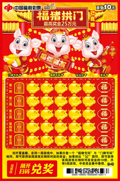 “己亥猪-福猪拱门”是为庆祝己亥猪年而推出的一款生肖纪念票。该款彩票取材于中国传统生肖文化,画面中形体饱满、憨厚可爱的三只福猪造型生动、热闹喜庆。彩票再以玩法区进行总体布局,烘托出红火、欢快的节日氛围,寓意福猪送福运。彩票采用“数字比对+特殊图符”玩法,简单好玩。