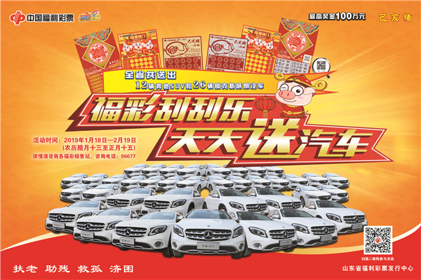 2019年1月18日—2月19日(农历腊月十三至正月十五),在山东省内购买福彩刮刮乐“己亥猪”5元、10元、20元彩票任意品种,用手机扫描玩法区内的二维码参与抽奖活动,就有机会获得奔驰SUV或别克新威朗汽车。