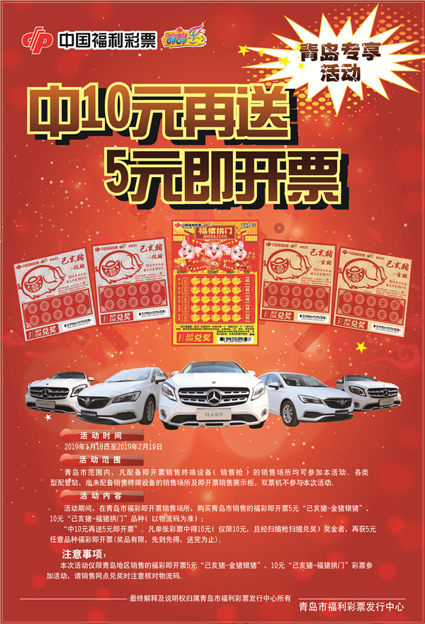 2019年1月18日—2月19日,在青岛市范围内配备即开票销售终端设备(销售枪)的销售场所购买青岛市销售的福彩即开票5元“己亥猪-金猪银猪”、10元“己亥猪-福猪拱门”品种(以物流码为准):“中10元再送5元即开票”。凡单张彩票中得10元(仅限10元,且经扫描枪扫描兑奖)奖金者,再获5元任意品种福彩即开票(奖品有限,先到先得,送完为止)。
