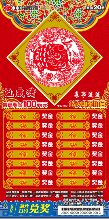 “己亥猪-喜事连连”是为庆祝己亥猪年而推出的一款生肖纪念票。该款彩票使用饱和度极高的大红油墨与金色油墨印刷,点缀丰富的彩色纹饰,给人带来强烈的视觉冲击。以剪纸为主题,票面中小猪与喜鹊嬉戏,喻意“猪年喜事连连”,充满浓郁的祝福之感。彩票采用多局三同图玩法,头奖高达100万元。
