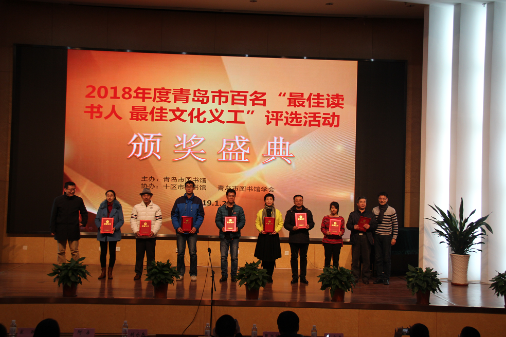 青岛新闻网1月21日讯 1月20日上午,2018年度青岛市百名“最佳读书人、最佳文化义工”暨“我与书的故事”征文颁奖仪式在青岛市图书馆三楼报告厅隆重举行。青岛市文化和旅游局公共文化处调研员张洪祥、青岛晚报副总编胡乐兵、青岛晚报文娱部主任姜宝虎、青岛市知名作家阿占、青岛市图书馆书记马云超、青岛市图书馆副馆长宋跃等领导和嘉宾出席了仪式。