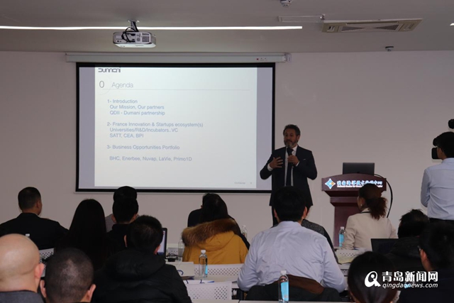 Maximilian先生受邀到访青岛,为在场嘉宾介绍了法国及欧洲创新生态环境,推介来自Dumani公司和法国原子能研究中心的60余项创新技术。据悉,Dumani的使命是帮助拥有关键技术资产的法国公司走向市场。他们的合作伙伴包括:AirLiquide、索迪斯、SebAlliance、赛峰等,因此有着多渠道的资源,平均每年专注于高科技领域,投资10-15个项目。法国原子能研究中心CEA-Tech是法国原子能与可替代能源委员会(CEA)下属的技术研究部门,法国原子能研究中心(CEA Tech Institutes)与诸多高科技创业公司建立了牢固的合作伙伴关系,使CEA Tech成为经济增长的主要贡献者。有50多家初创公司通过专利许可协议或联合研发实验室开发和商业化CEA-Tech的技术与CEA-Tech密切合作。
