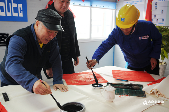 青岛新闻网1月24日讯(记者 张力伟 通讯员 孙静 王彦玲)23日,中建三局总承包公司山东分公司联合青岛市总工会开展“送文化进基层”书画书笔会交流活动,来自青岛市书法协会的6位书画家来到中建三局中船重工海洋装备研究院项目与农民工工友齐聚,以书画寄情怀,讴歌劳动美。