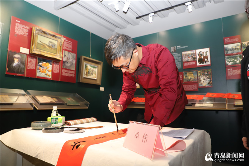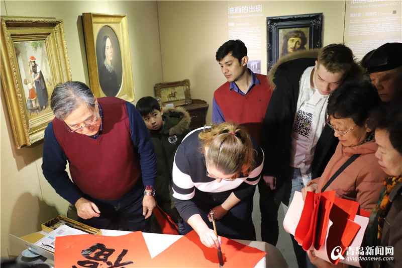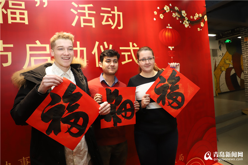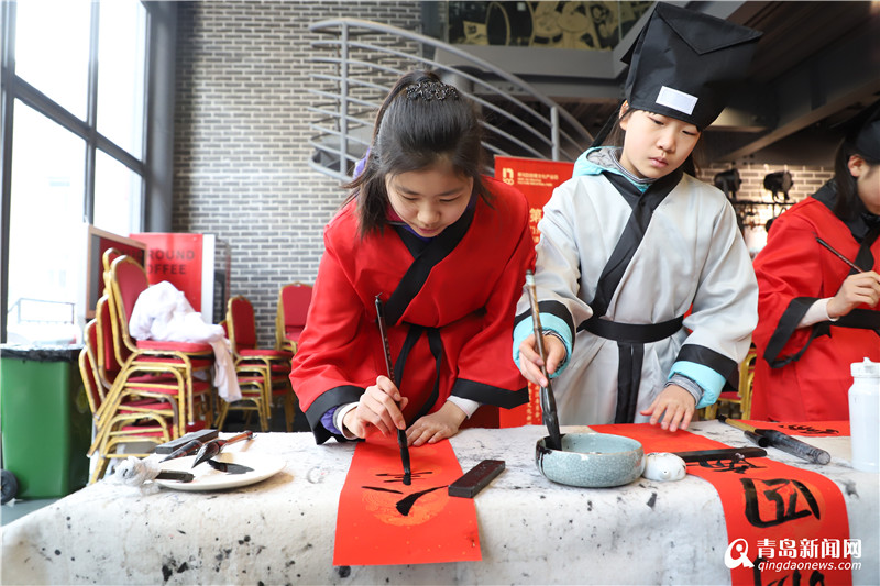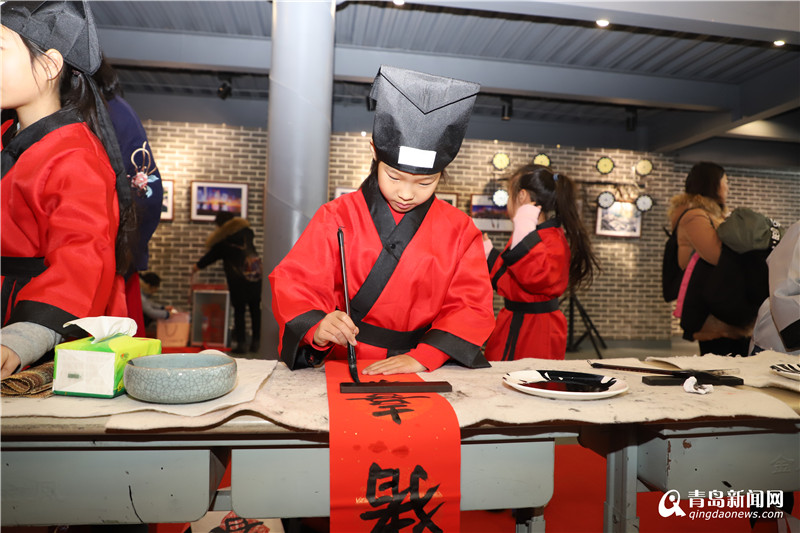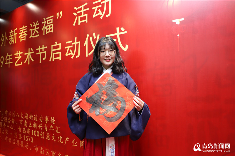 当然,最热闹的还要属“新春送福”环节了,15位岛城著名书画家现场挥毫,为大家免费写福、写春联,清新的墨香、火红的纸张和着群众的笑脸,映衬出浓浓的节日气氛。外国友人也参与其中并现场学习写“福”,为活动增加了“国际范儿”。来自新100“寻真书院”的32位小书法家们身着汉服前来助阵,让我们欣慰中国书法传统艺术后继有人。