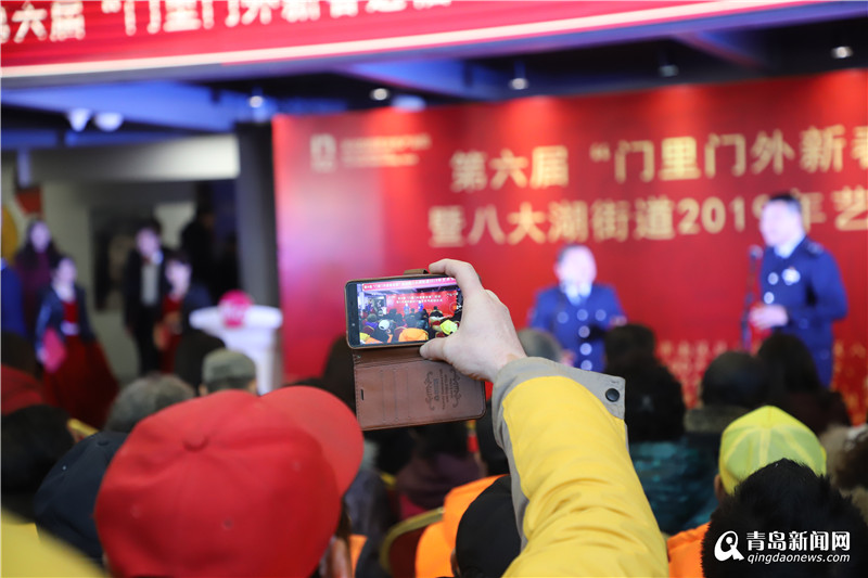 此刻,市南区总工会的领导和工作人员们正热火朝天地为众多外地在青的新市民朋友们发放春节礼品,送上“娘家人”的祝福。大厅里,伴随着激扬的曲调和优雅的身姿,八大湖街道2019年艺术节也在此拉开帷幕,作为本届活动的扩展单元,艺术节为大家带来多个精彩的文艺节目,台上歌舞纷呈,台下掌声热烈。