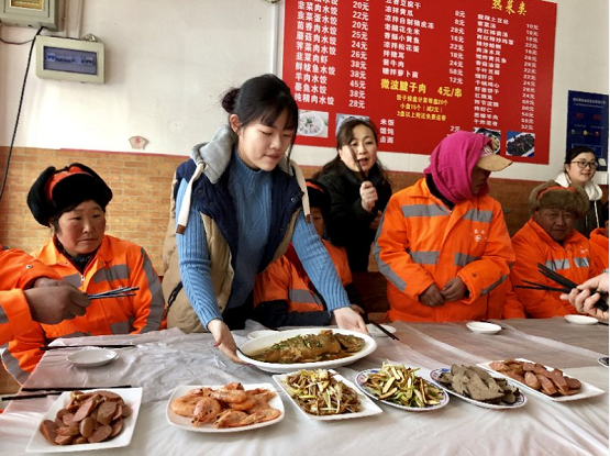 青岛新闻网1月28日讯(通讯员:徐玲玲) 2019己亥年春节的脚步临近,不少在外打拼的人都踏上了返乡的行程。然而还有那么一些人,为了岛城更加清洁美丽、为了满足市民们节前的生活需求还在不断奔波劳碌着。他们中,有“城市美容师”之称的环卫工人,有为城市建设添砖加瓦的建设工人,还有不少为居民提供生活服务的家政服务者们……为了确保这些新市民能够温暖过节,日前,市北区合肥路街道党工委启动了“爱心接力传公益暖冬行”志愿服务活动,小年当天首站,街道计生协会、关心下一代工作委员会联合城管科、妇联、延兴路社区、共建单位宁安路小学、新都口腔医院等一起走进幸福人饺子馆,为小年在这里免费就餐的环卫工人们送上节日的问候和祝福。