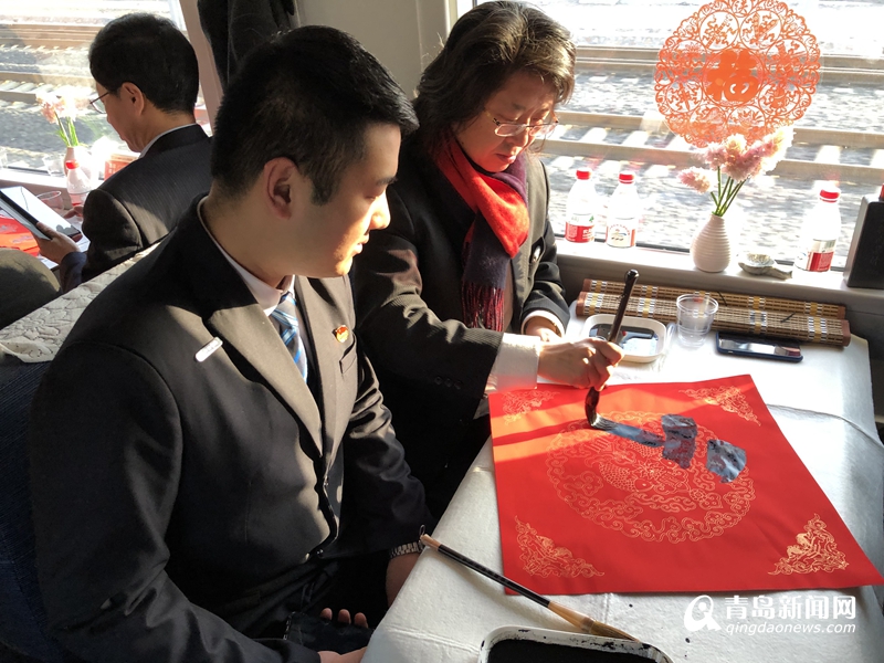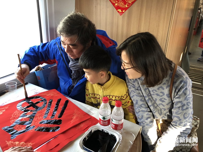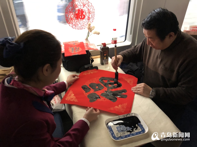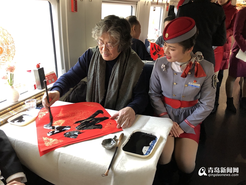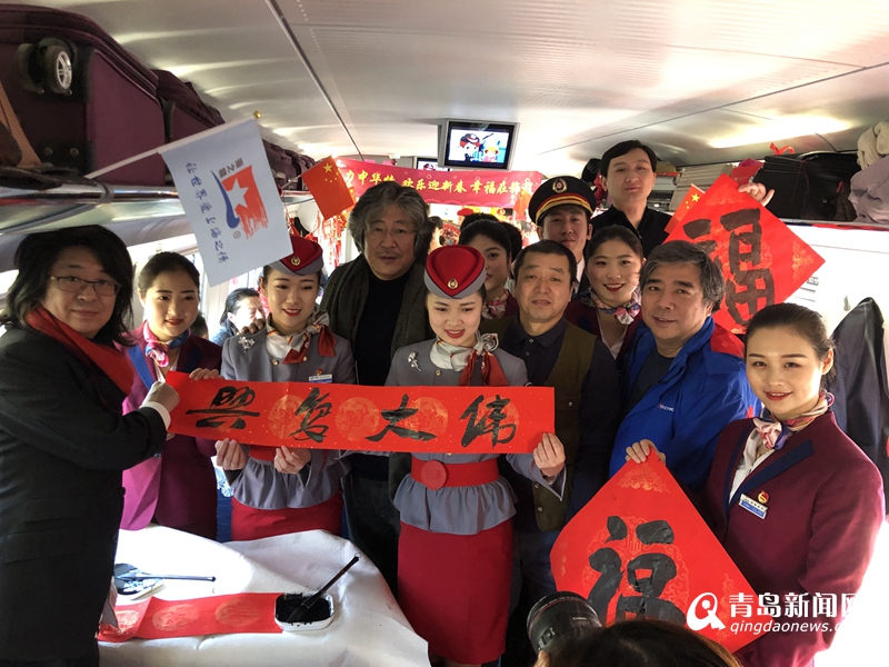 车厢内,青岛市文联党组书记、副主席魏胜吉与范国强、张景、赵善亭、郭强、宋文京、姜乐平、张耀辉、倪汉婴、王秀泉、苏万利等10余位青岛书法名家挥毫泼墨,将幅幅写满春节祝福的大红福字及春联送到列车乘务组人员及返乡务工人员手中,为他们送上春节祝福。对他们为青岛城市建设的付出表达敬意。
