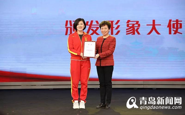 青岛市人民政府副市长栾新(右)向山东省青岛体育训练中心副主任、2008北京奥运会射箭个人冠军张娟娟颁发形象大使证书