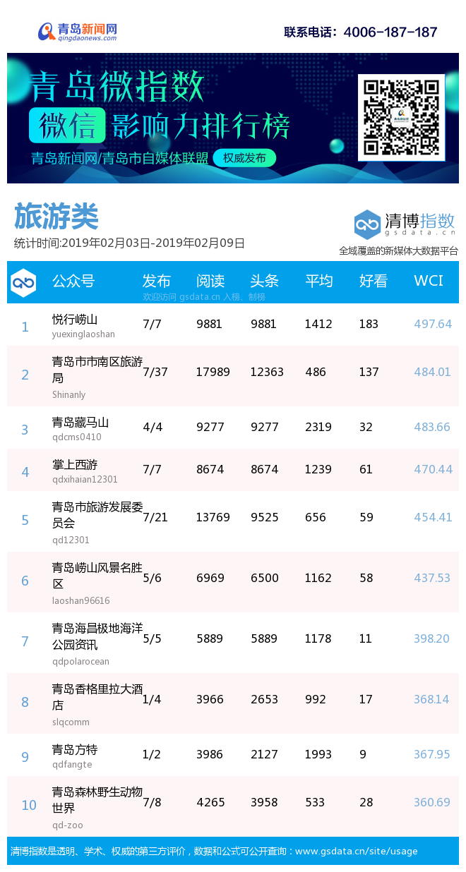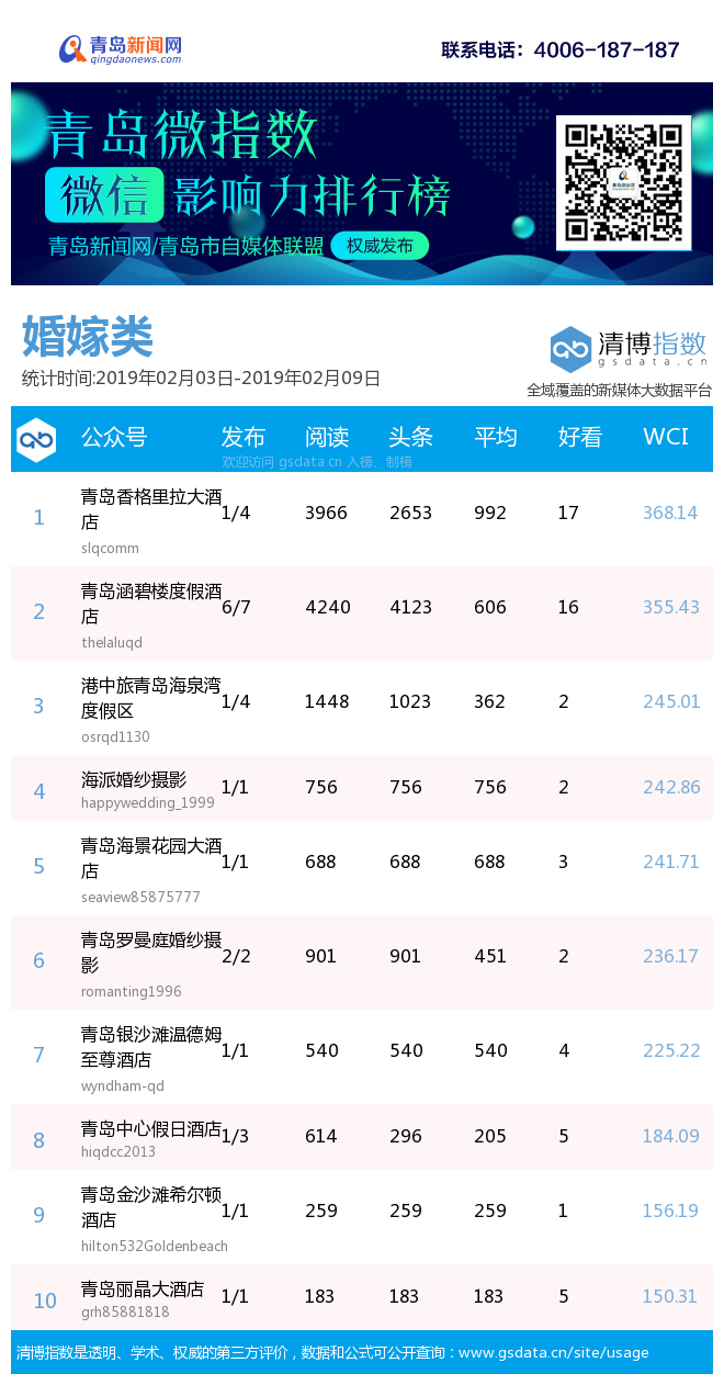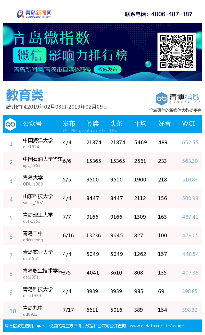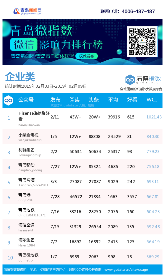 3、本次榜单收录了青岛14个行业微信公众号,如您的账号暂未收录,可联系4006-187-187。