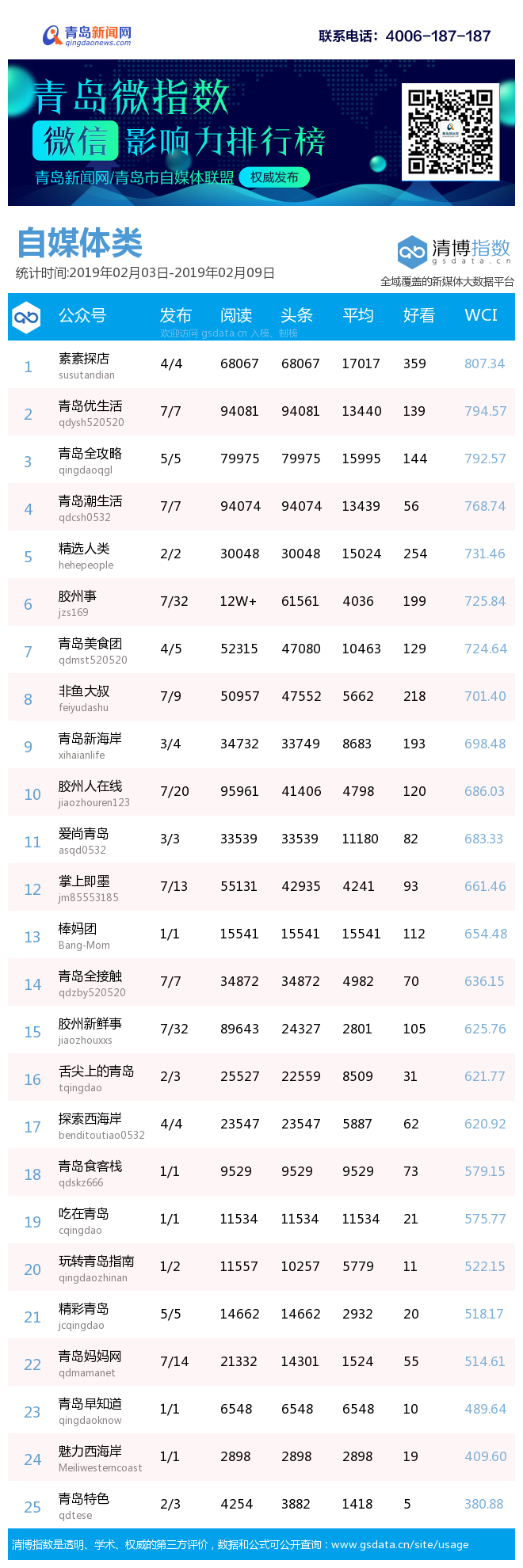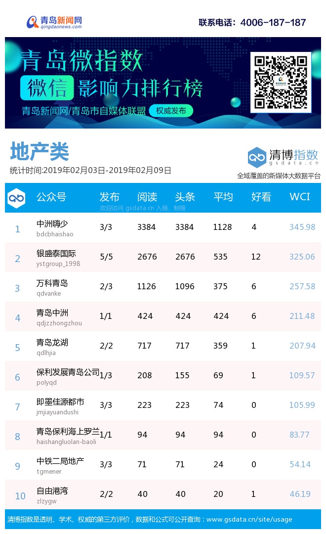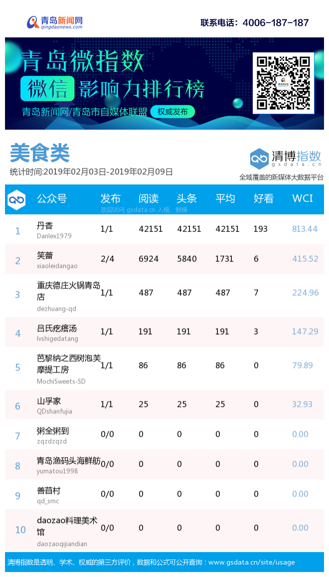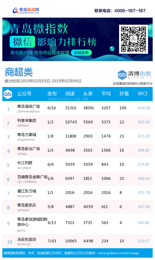 3、本次榜单收录了青岛14个行业微信公众号,如您的账号暂未收录,可联系4006-187-187。
