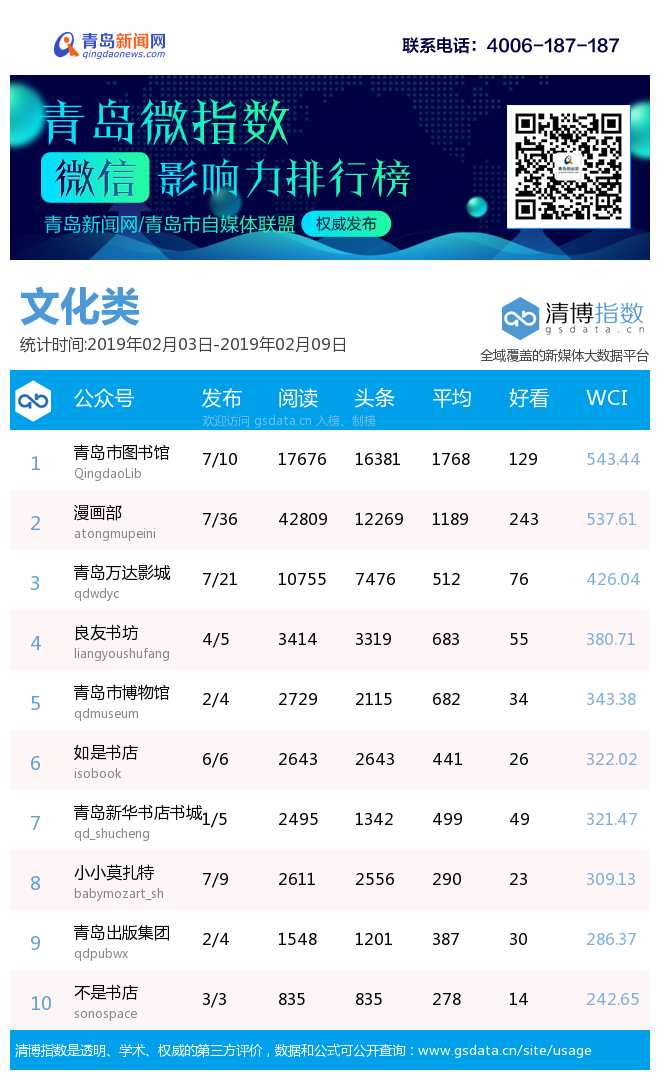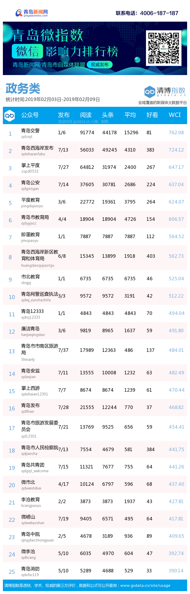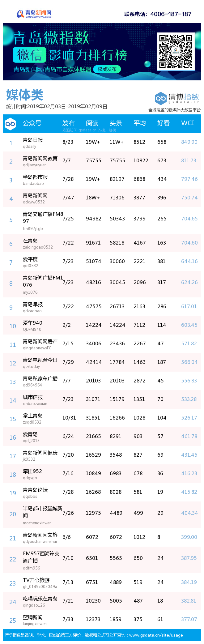 青岛新闻网2月11日讯(记者 邢书玲)由青岛新闻网、清博指数平台联手打造的“青岛微指数微信影响力排行榜”今日发布一周(2月3日-2月9日)榜单。