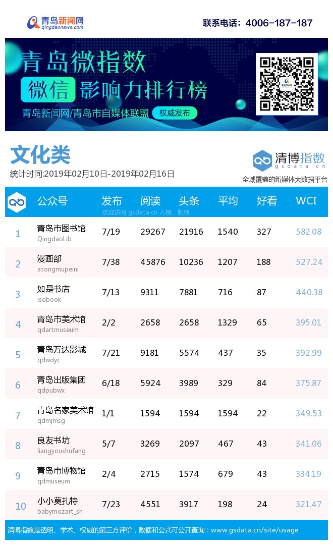 青岛新闻网2月18日讯(记者 邢书玲)由青岛新闻网、清博指数平台联手打造的“青岛微指数微信影响力排行榜”今日发布一周(2月10日-2月16日)榜单。