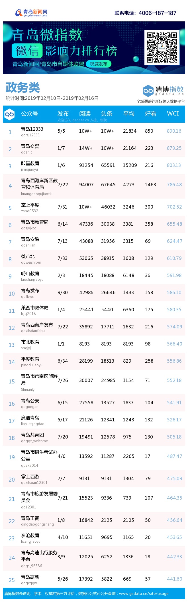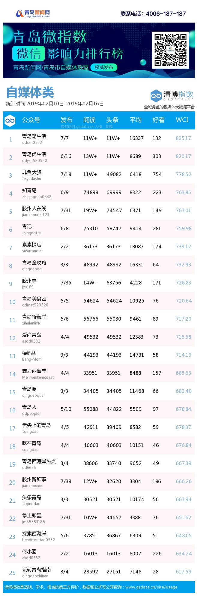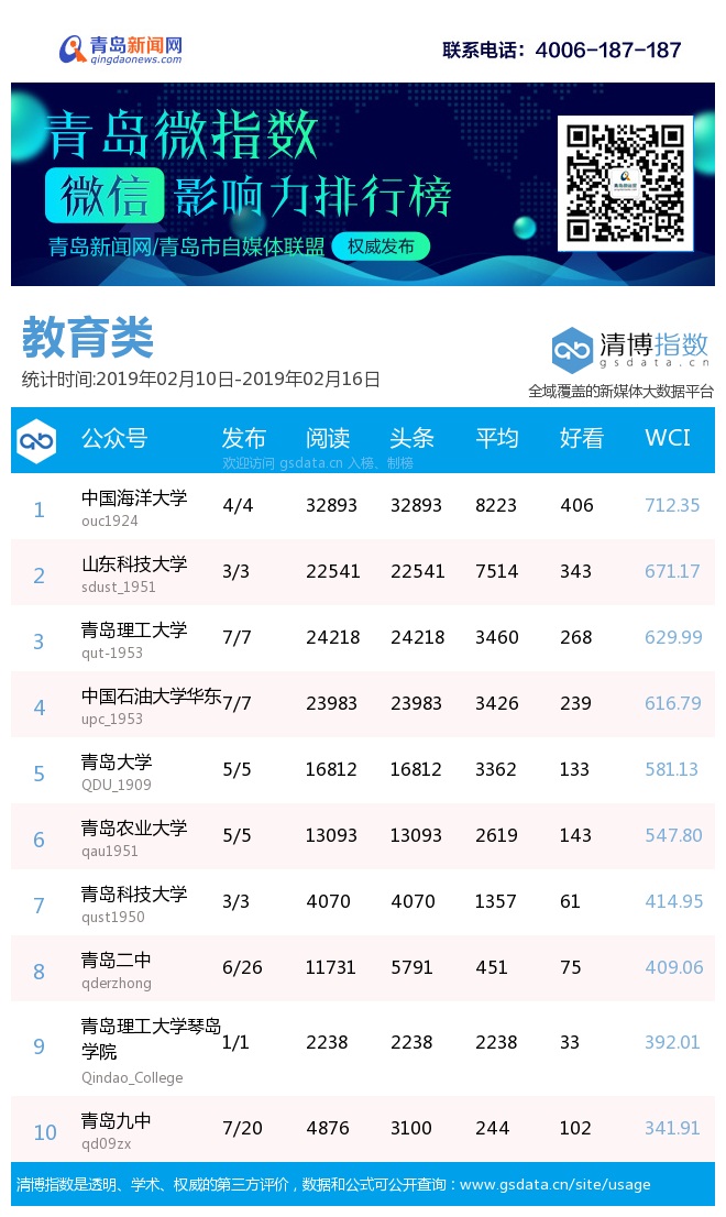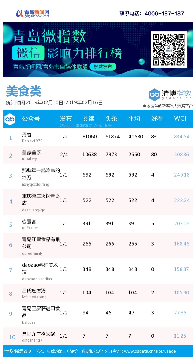 3、本次榜单收录了青岛14个行业微信公众号,如您的账号暂未收录,可联系4006-187-187。