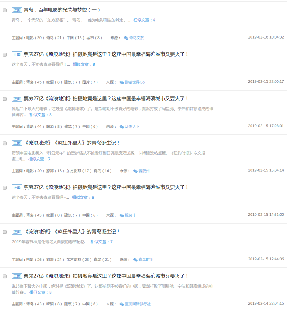 截止到2月16日下午13:00,共监测到关于《流浪地球》、《疯狂外星人》青岛拍摄的信息共计518条,其中,网页端信息高达273条,微博、微信等新媒体平台信息占据68条。