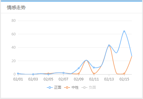 从情感走势图中,我们可以看到,2月5日首映过后,《流浪地球》、《疯狂外星人》在青岛拍摄的信息不断发酵,在2月9日-2月16日期间,报道呈现大幅度增长,尤其是2月15日当天,更是达到了64的峰值。