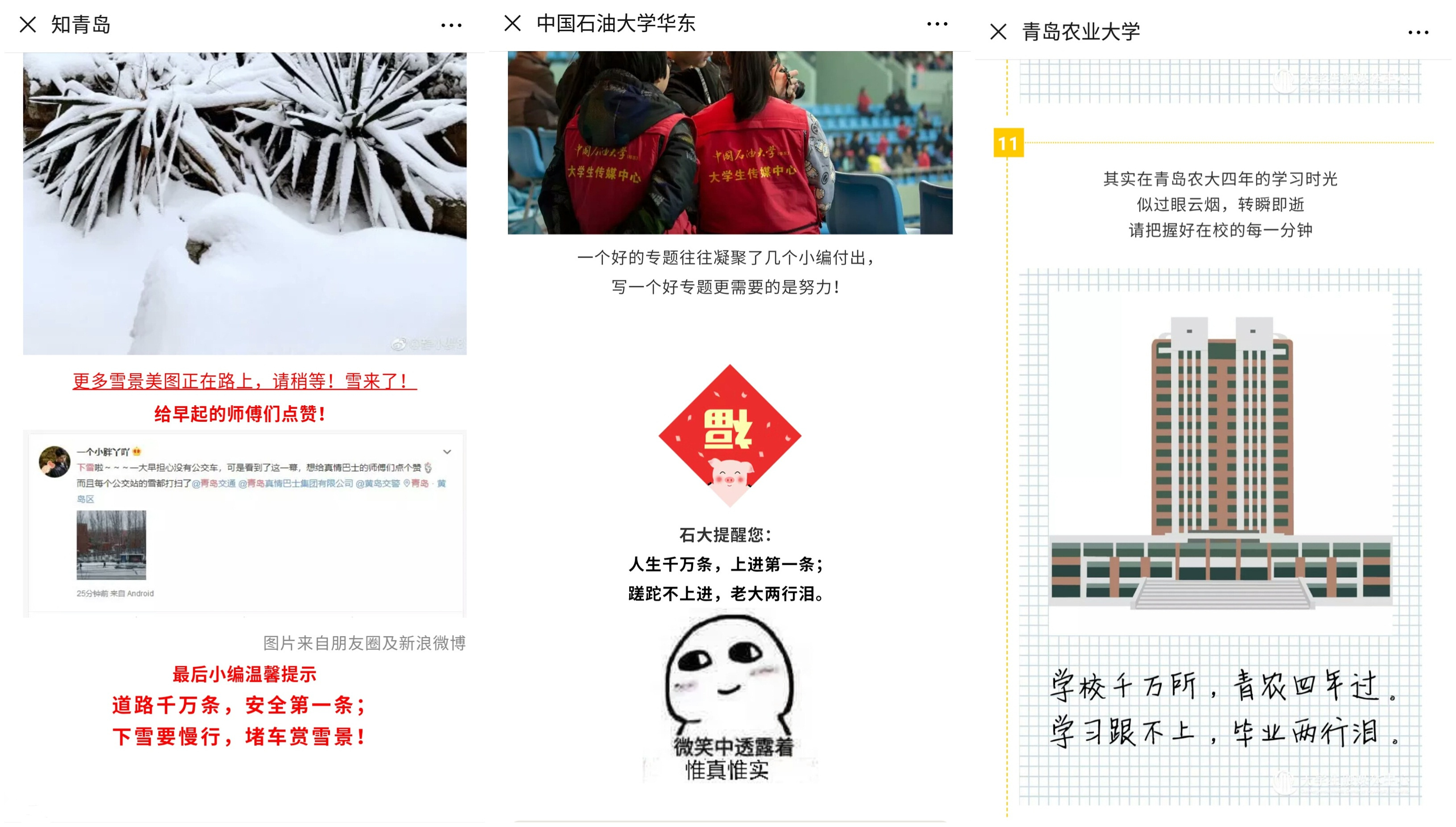 其中尤以“青岛日报”、“青岛新闻网”、“青岛私家车广播”、“知青岛”、“青岛农业大学”、“中国石油大学华东”最具代表性,青岛自媒体人用独特的方式,向“青岛出品”致敬,同时也为宣传美丽青岛做出极大贡献。