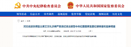 2018年7月31日,经中共中央批准,中央纪委国家监委对河北省政协原党组副书记、副主席艾文礼严重违纪违法问题进行了立案审查调查。