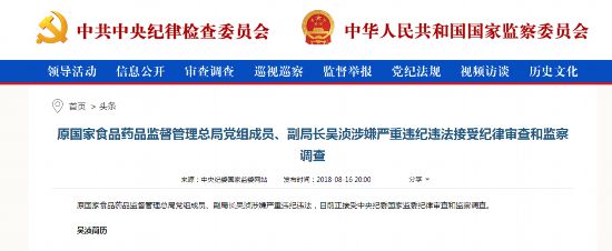 2018年8月16日,经中共中央批准,中央纪委国家监委对原国家食品药品监督管理总局党组成员、副局长吴浈严重违纪违法问题进行了立案审查调查。