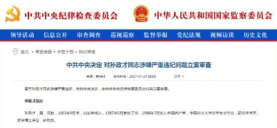 2017年7月24日,中共中央决定,由中共中央纪律检查委员会对第十八届中央政治局原委员、重庆市委原书记孙政才立案审查。