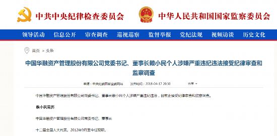 2018年4月17日,中央纪委国家监委对中国华融资产管理股份有限公司原党委书记、董事长赖小民严重违纪违法问题进行了立案审查调查。