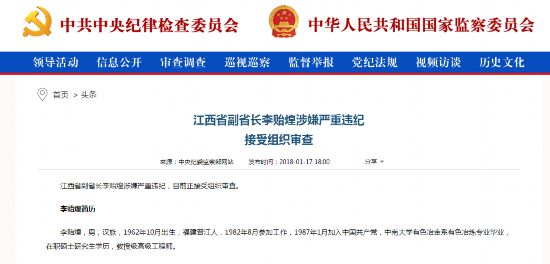 2018年1月17日,经中共中央批准,中共中央纪委对江西省政府原党组成员、副省长李贻煌严重违纪问题进行了立案审查。
