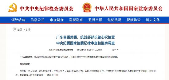 2018年7月11日,经中共中央批准,中央纪委国家监委对广东省委原常委、统战部原部长曾志权严重违纪违法问题进行了立案审查调查。