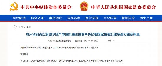 2018年5月4日,经中共中央批准,中央纪委国家监委对贵州省政府原党组成员、副省长蒲波严重违纪违法问题进行了立案审查调查。