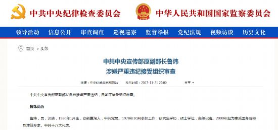 2017年11月21日,经中共中央批准,中共中央纪委对中央宣传部原副部长、中央网信办原主任鲁炜严重违纪问题立案审查。