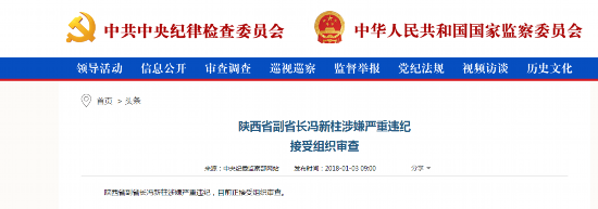 2018年1月3日,经中共中央批准,中共中央纪委对陕西省政府原党组成员、副省长冯新柱严重违纪问题进行了立案审查。