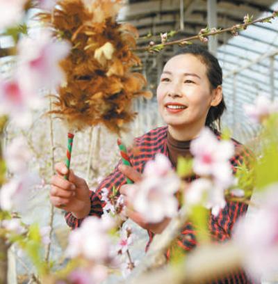 村民李金平在河南省夏邑县北岭镇刘集村新型职业农民刘万平的家庭农场为油桃授粉。苗育才摄(人民视觉)