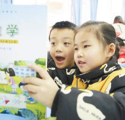 重庆市北碚区,孩子们纷纷走进校园,开始新学期学习。图为一年级的孩子们在阅读新学期领到的新书。秦廷富摄(人民视觉)