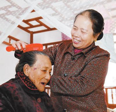 福建省莆田市北岸开发区开展“百孝之星”评选表彰活动。图为东埔镇前范村获得“百孝之星”称号的陈秋连(右)为97岁的婆婆梳头。新华社记者 张国俊 摄