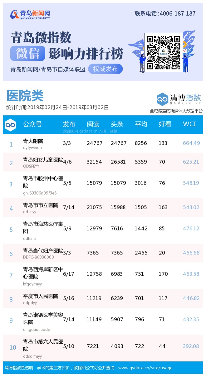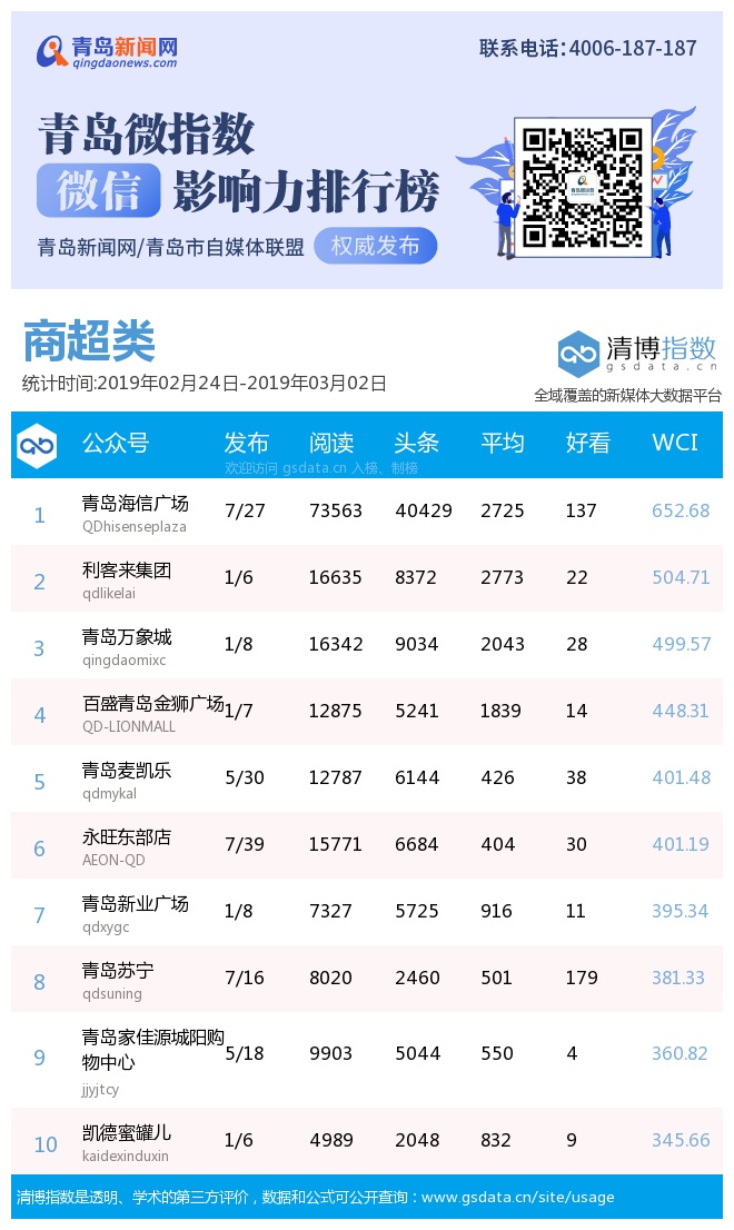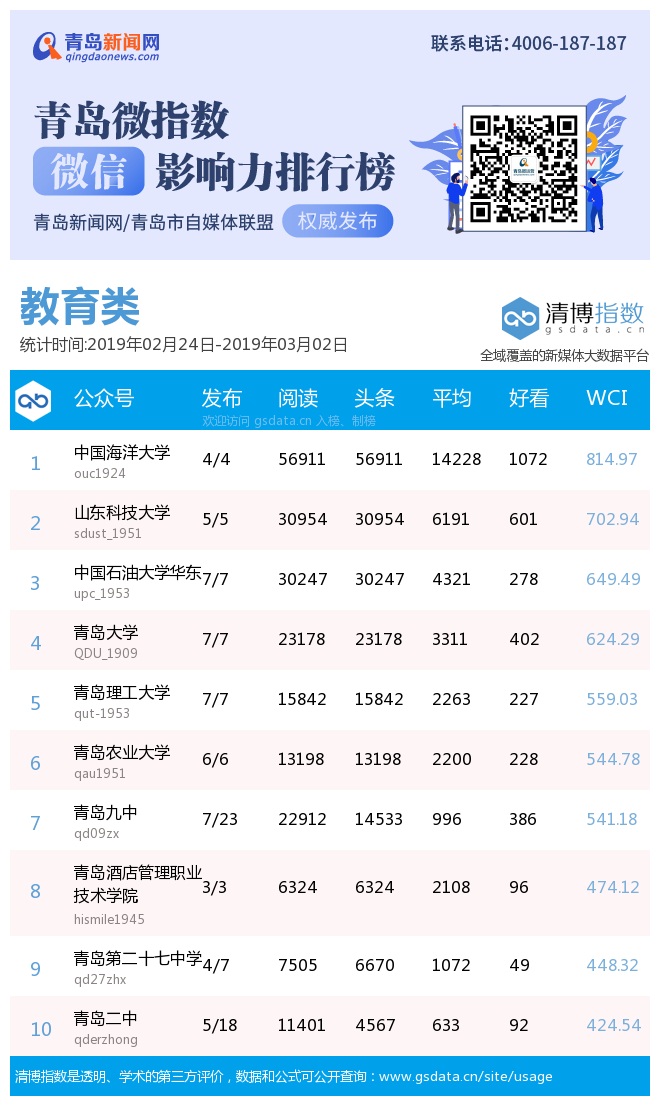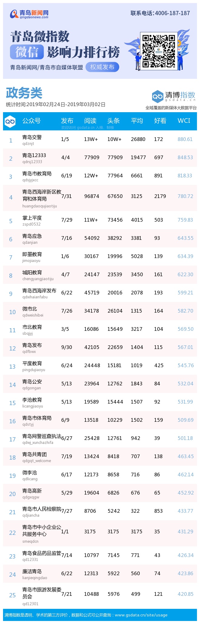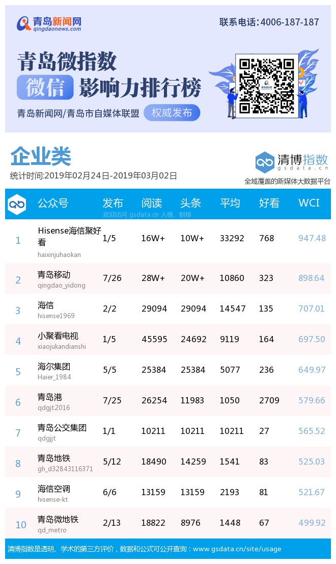 3、本次榜单收录了青岛14个行业微信公众号,如您的账号暂未收录,可联系4006-187-187。