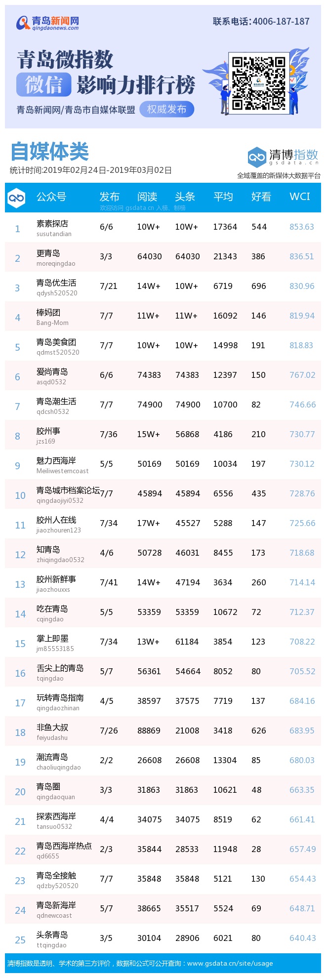 青岛新闻网3月4日讯(记者 邢书玲)由青岛新闻网、清博指数平台联手打造的“青岛微指数微信影响力排行榜”今日发布一周(2月24日-3月2日)榜单。
