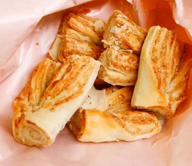 英记楼的鸭尾酥已获批山东省非物质文化遗产。一块小小的鸭尾酥叠加了几十层酥皮,每一层都薄如蝉翼。吃一口椒盐和酥皮的香味交融,难怪有这么多人偏爱。