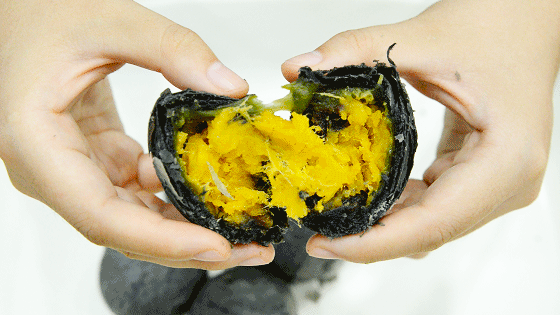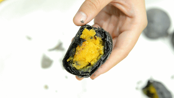 麻薯蛋黄的酥外皮是添加了竹炭做成,掰开以后还可以看到肉松和麻薯在拉扯,蛋黄的咸香和微甜的豆沙在口中随咀嚼不断交织,还可以吃到丝丝缕缕的肉松!最奇妙的是Q弹松软的麻薯,丰富的口感怎么吃也吃不够!