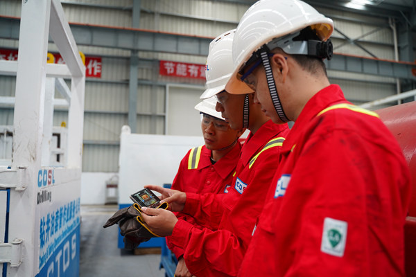 中国海油中海油服深圳分公司一线员工工作间隙通过手机直播收听政府工作报告
