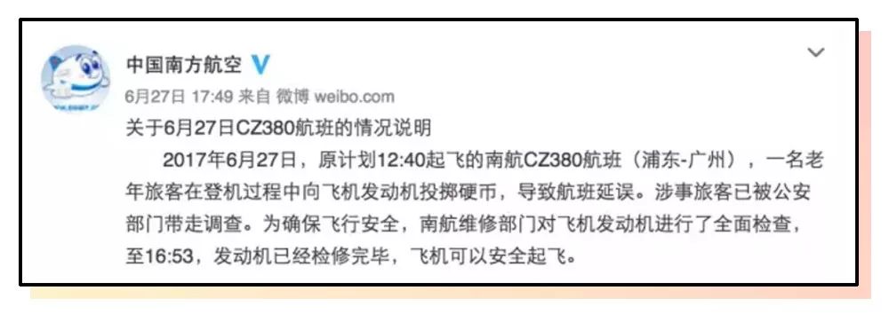 起因是,有位80岁的老奶奶朝着飞机的发动机撒了一把硬币,多亏中途被其他乘客发现。