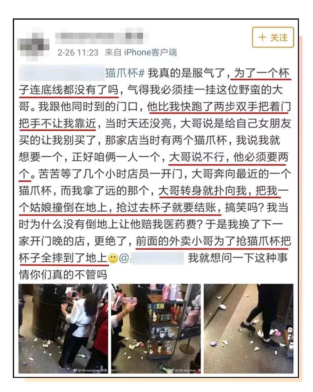 还有个外卖小哥也够“给力”的,买不到就抢,抢不到就毁掉,把“猫爪杯”摔个稀巴烂。