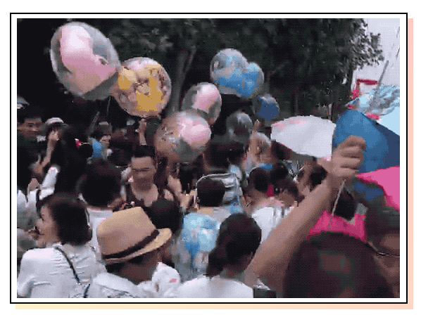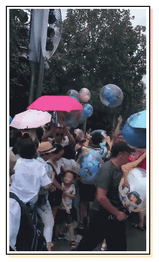 众人纷纷挤上来,一边互相推搡着工作人员,一边趁乱抢走气球,丝毫没有意识到自己是在抢劫。
