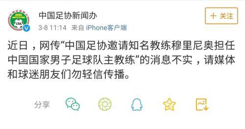 8日,中国足协新闻办官方微博发文辟谣,称此前网传“中国足协邀请知名教练穆里尼奥担任中国国家男子足球队主教练”的消息不实。