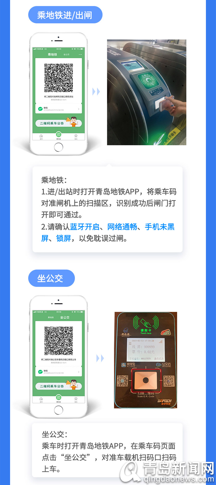 (3)乘地铁进、出站前均须提前打开青岛地铁APP,点击【乘车码】,并打开手机蓝牙;(4)使用乘车码乘车须遵循“一人一码”“一进一出”原则;