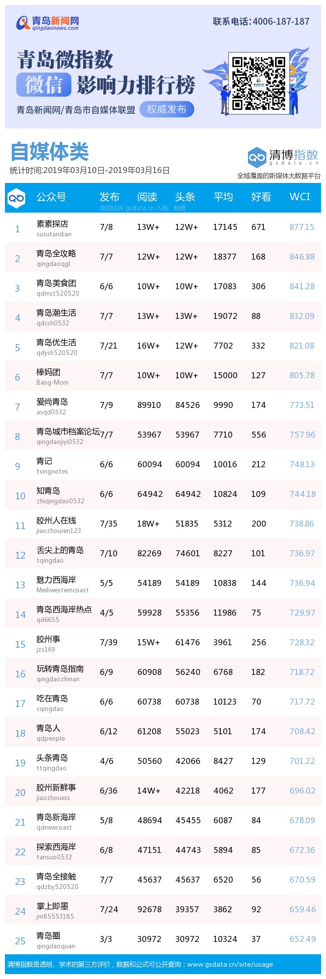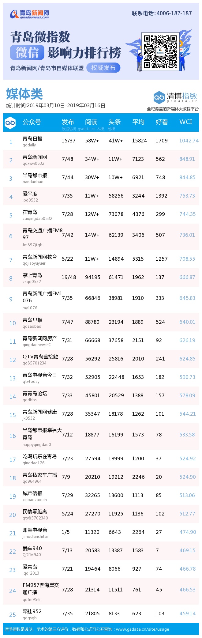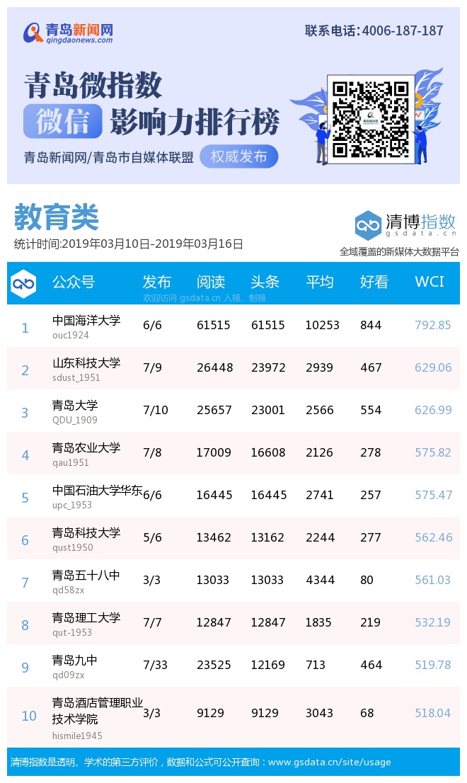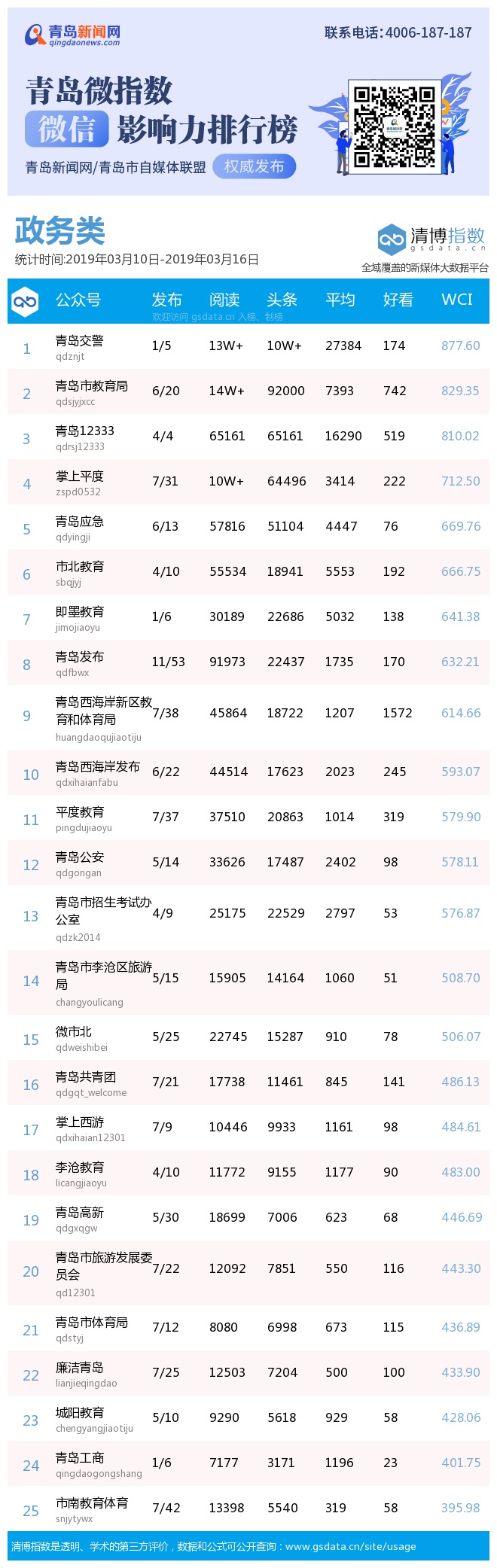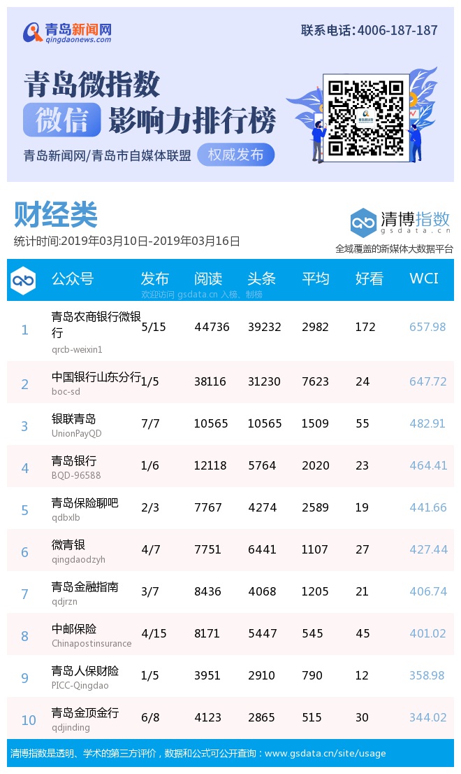 青岛新闻网3月18日讯(记者 邢书玲)由青岛新闻网、清博指数平台联手打造的“青岛微指数微信影响力排行榜”今日发布一周(3月10日-3月16日)榜单。