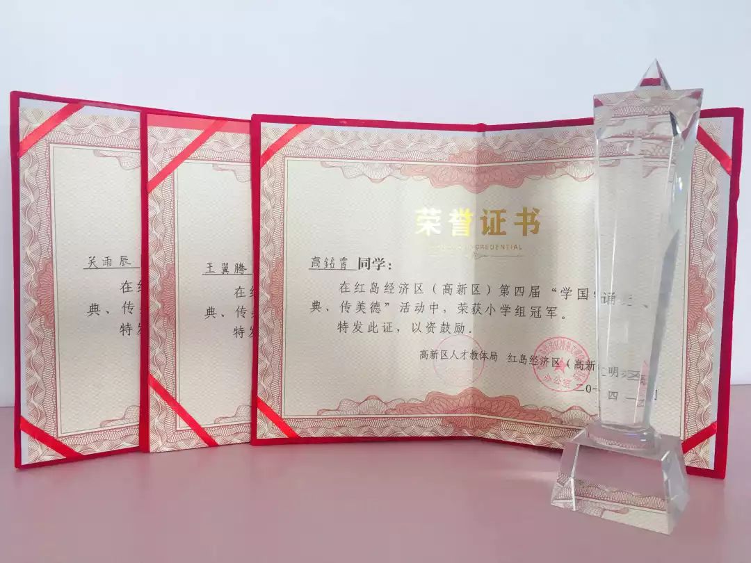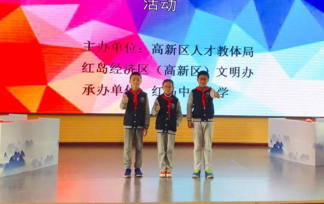 青岛新闻网4月17日讯 今日,青岛市高新区“学国学、诵经典、传美德”竞赛活动在红岛中心小学举行。来自全区9个战队和33名同学组成本次活动参赛队伍,来自高新区银海学校的高铭霄、王翼腾和关雨辰组成代表队参赛,在经过近1个多小时的激烈角逐,以优异的表现荣获了小学组的“冠军”。