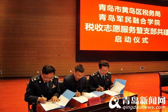 青岛新闻网4月28日讯 今天,青岛市黄岛区税务局和青岛军民融合学院税收志愿服务暨支部共建启动仪式正式召开,形成税收志愿服务长效机制,为进一步落实国务院“放管服”有关规定,扩大减税降费宣传面,提升税收营商环境,锻炼学生社会实践能力打下坚实基础。