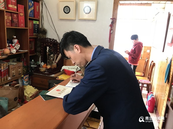 王哥庄市场管理所王林正在对商户营业执照进行登记。